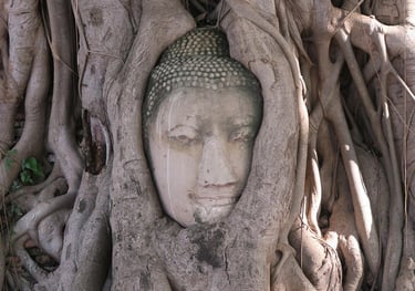 English: “Wat Mahathat – Famous for the Buddha head entwined in tree roots, an iconic image of Ayutthaya.”