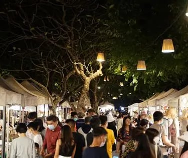 English: “Cicada & Tamarind Night Markets – Art, street food, and a lively evening atmosphere.”