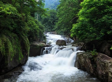 A scenic waterfall surrounded by lush forest, perfect for hiking and photography.