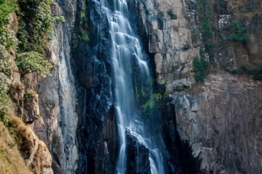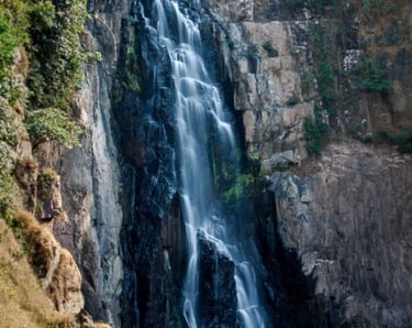 อังกฤษ: A picturesque waterfall, about 25 meters high with clear water and shady surroundings. Perfect for a refreshing swim at the base