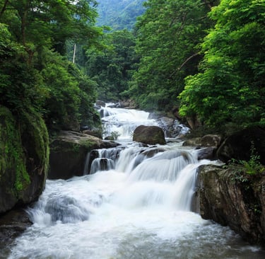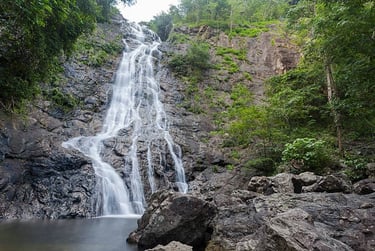 อังกฤษ: A scenic waterfall surrounded by lush forest, perfect for hiking and photography.