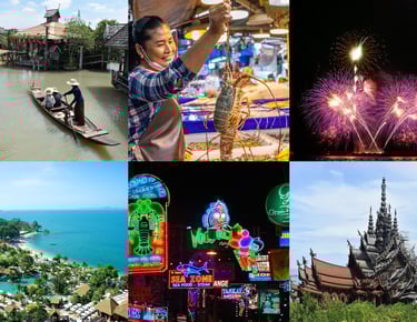 พัทยา (Pattaya) จุดเด่น: เมืองชายทะเลยอดนิยม ใกล้กรุงเทพคำอธิบาย:พัทยาเป็นเมืองท่องเที่ยวที่ไม่เคยหลับใหล มีชายหาดสวยงาม กิจกรรมทางทะเลมากมาย เช่น เจ็ตสกี พาราเซลลิ่ง และเกาะใกล้เคียงอย่างเกาะล้าน นอกจากนี้ยังมีสวนสนุก ตลาดกลางคืน และสถานบันเทิงครบครัน